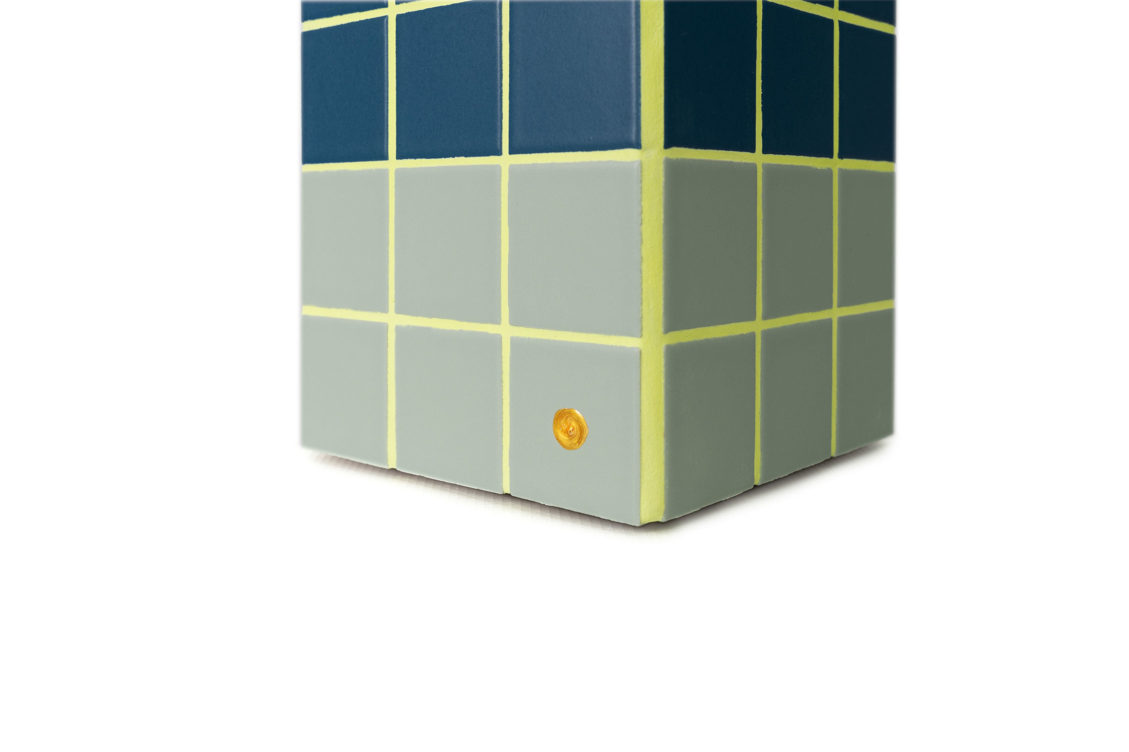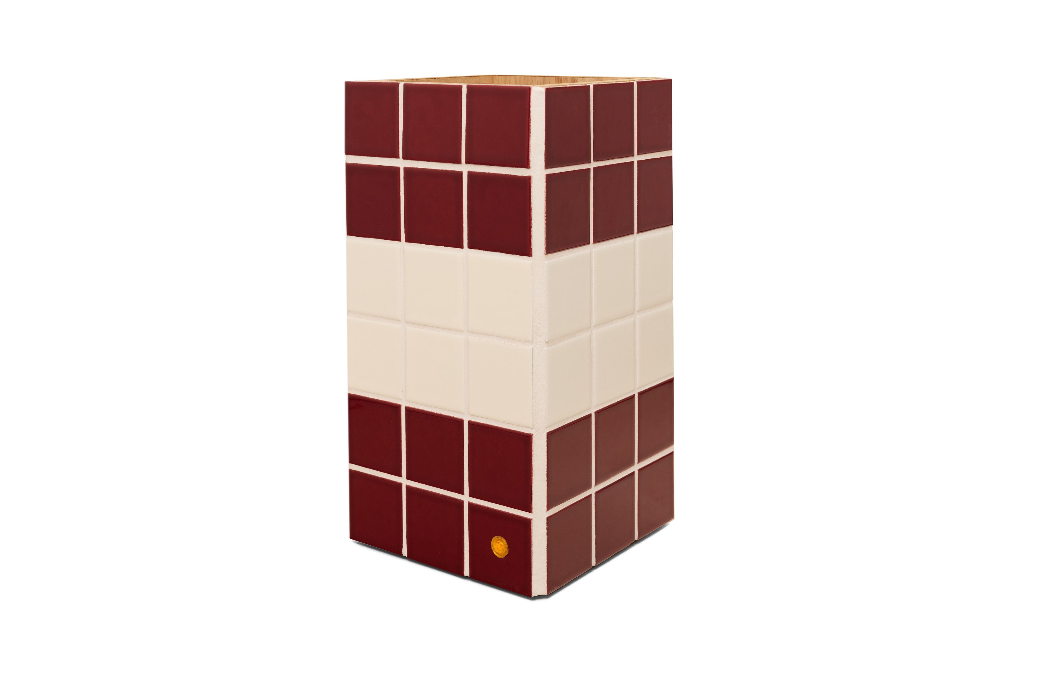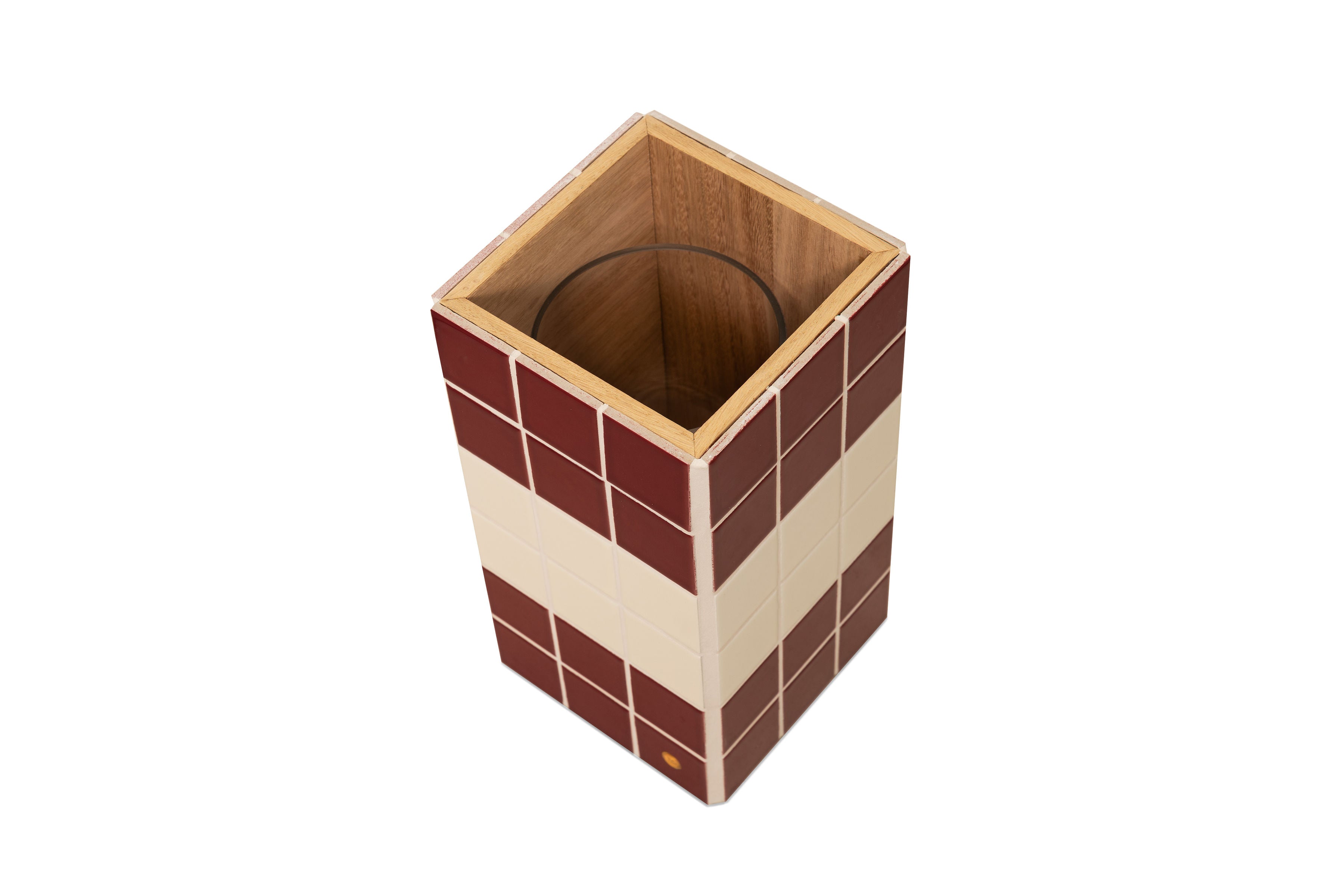 The cache vase is made of marine wood and Italian ceramic tiles of 5 x 5 cm.