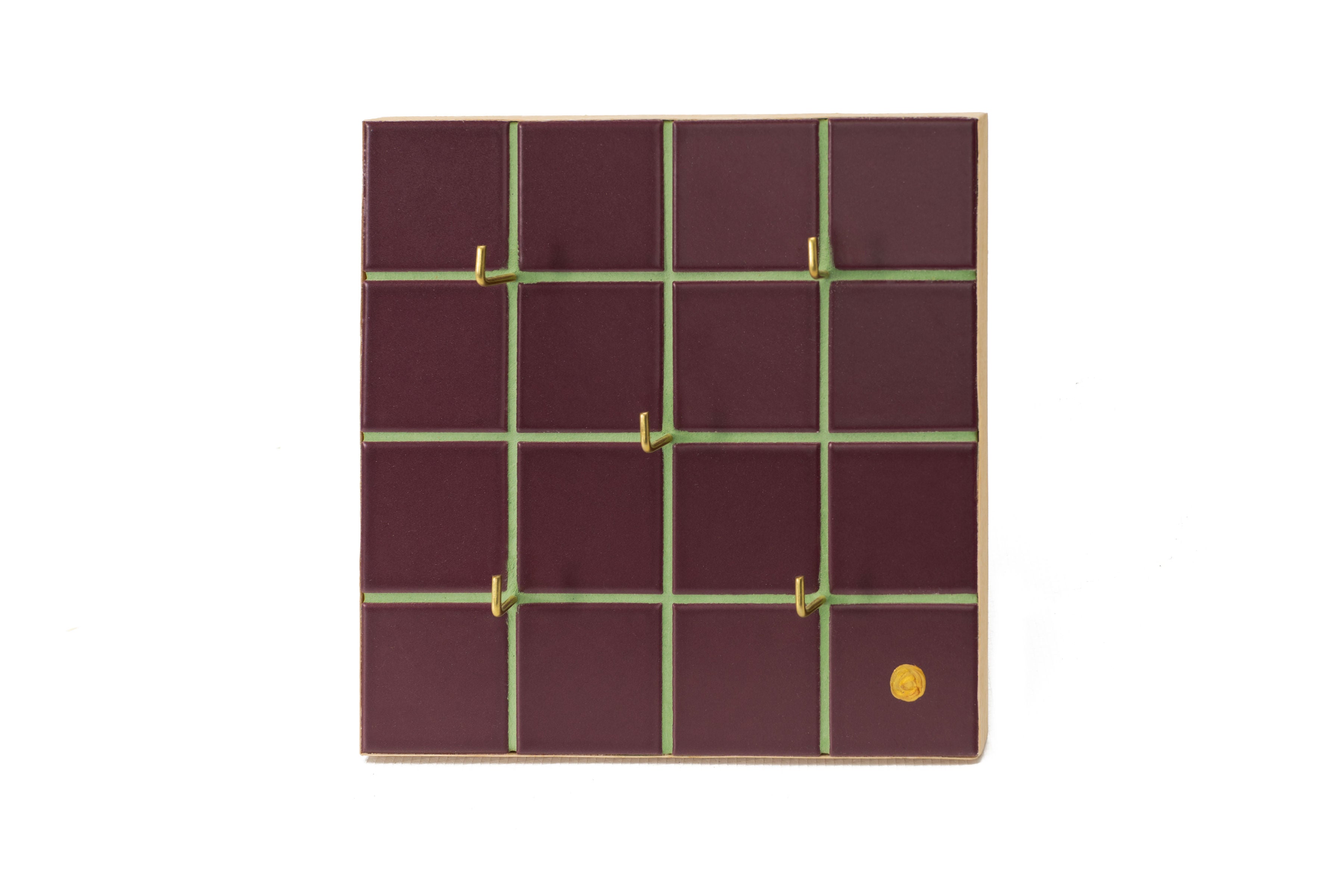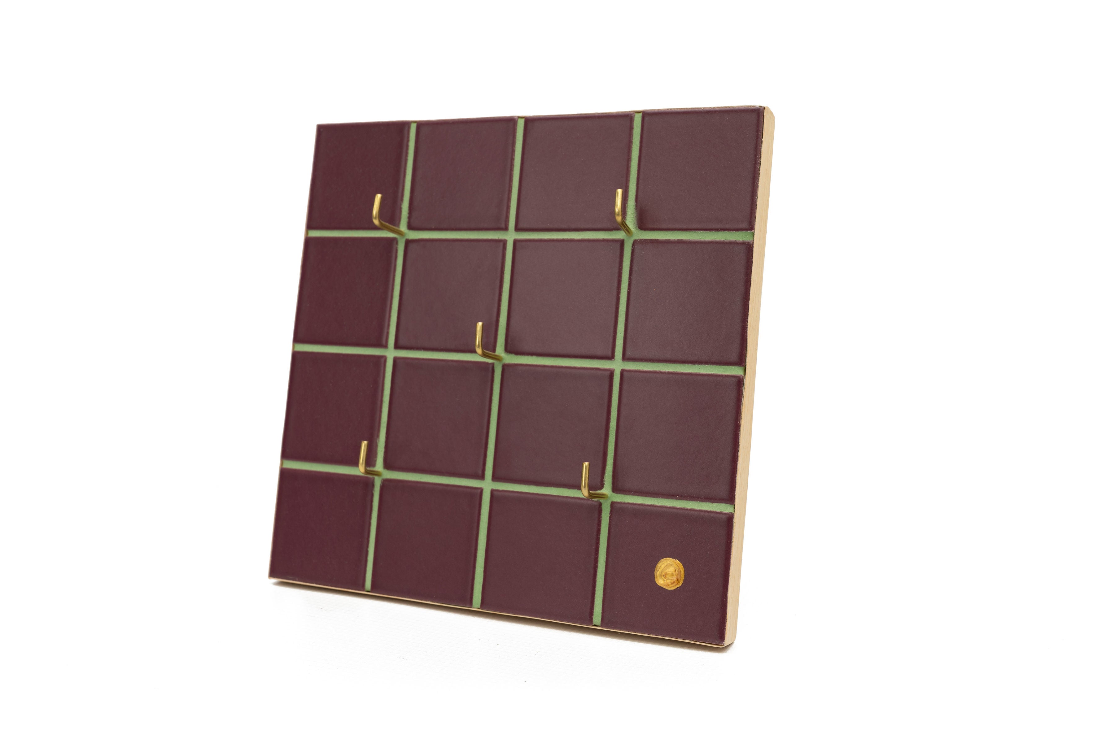 The jewelry/key ceramic holder is made of marine wood and glazed porcelain ceramic tiles of 5 x 5 cm, made in Italy for Soel.d