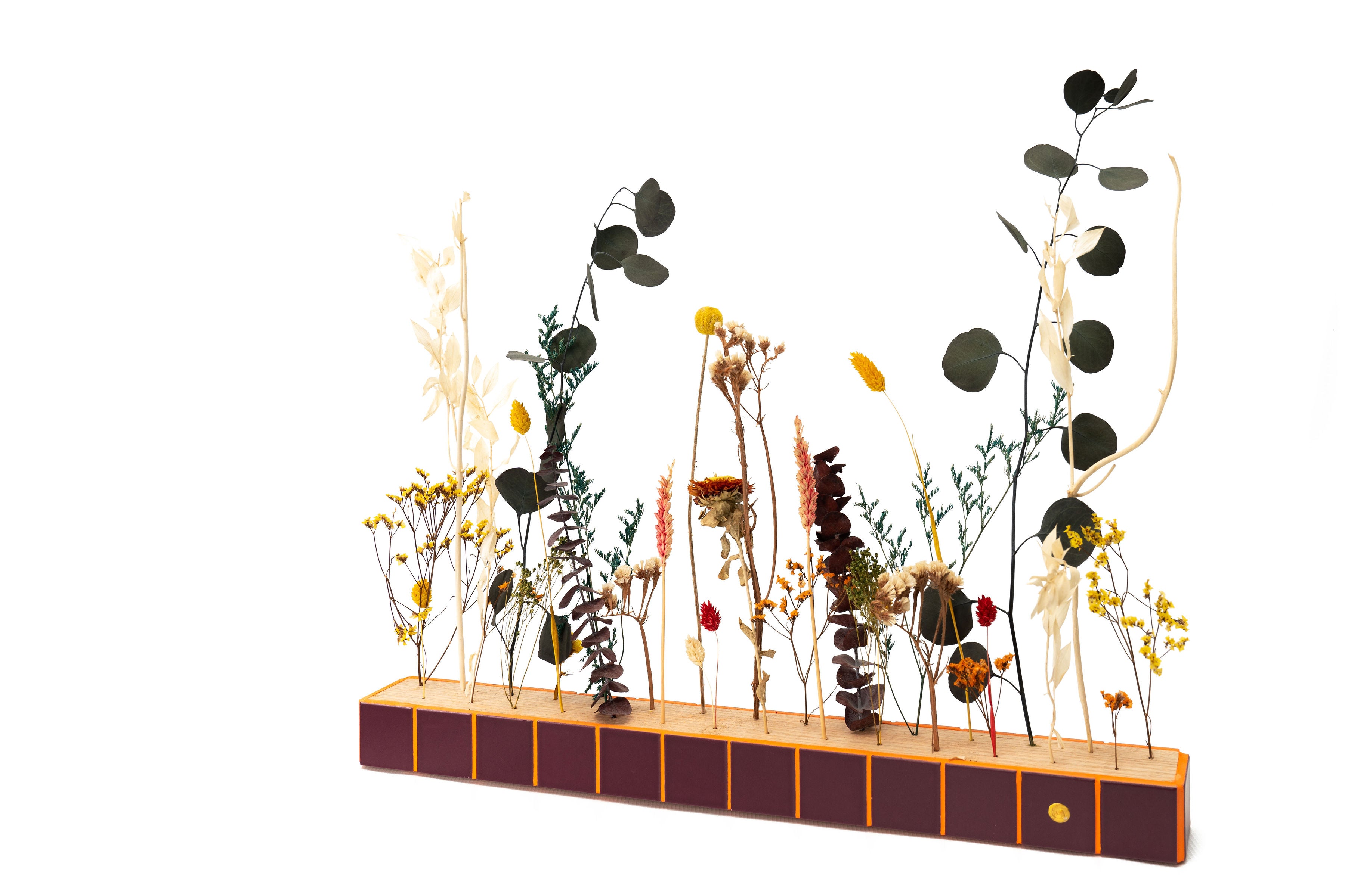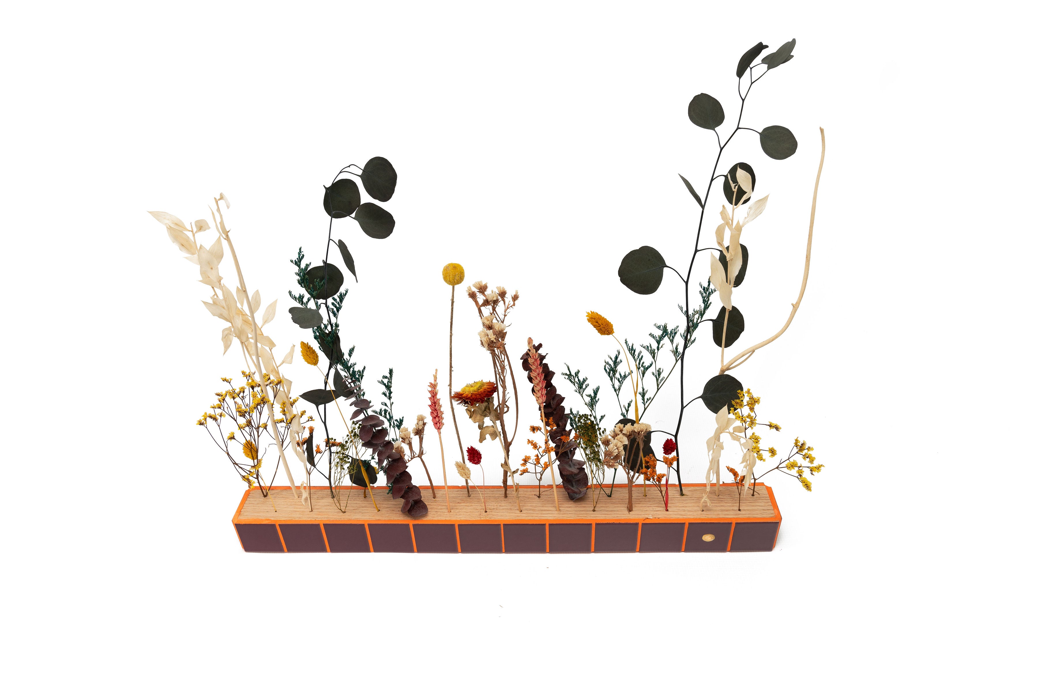 Expertly crafted, The Flower Bar boasts an oak bar and vibrant tiled colors. Adorned with dried flowers, it provides a unique and stylish addition to any room. Transform your space into a stunning floral haven with this sophisticated piece which can be placed on a table as a center piece, or on a console for welcoming guests as well as on the wall.
