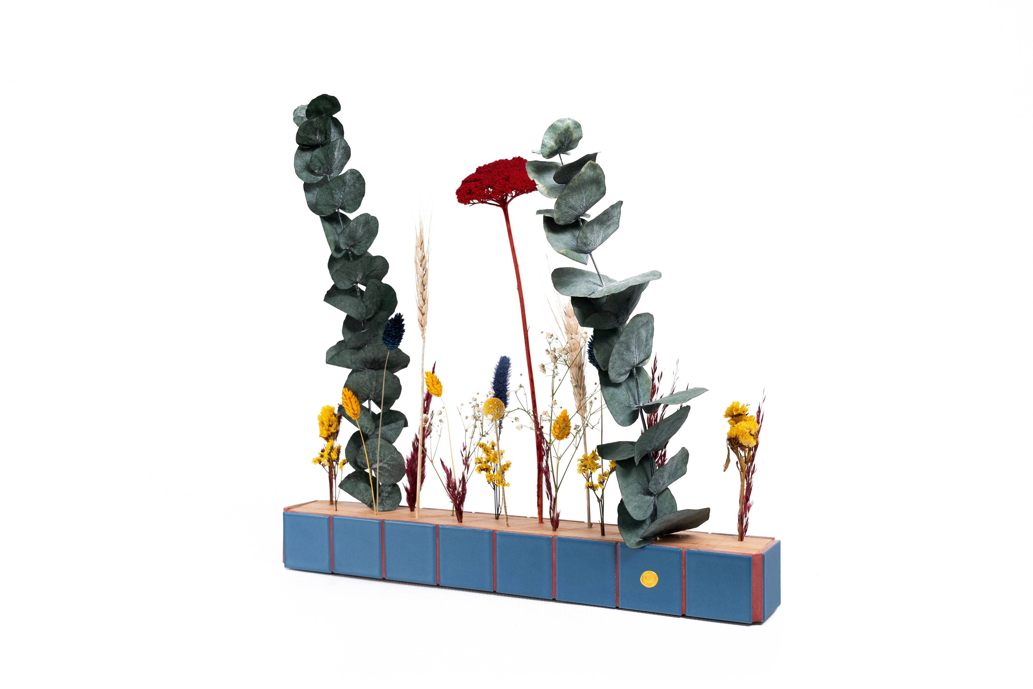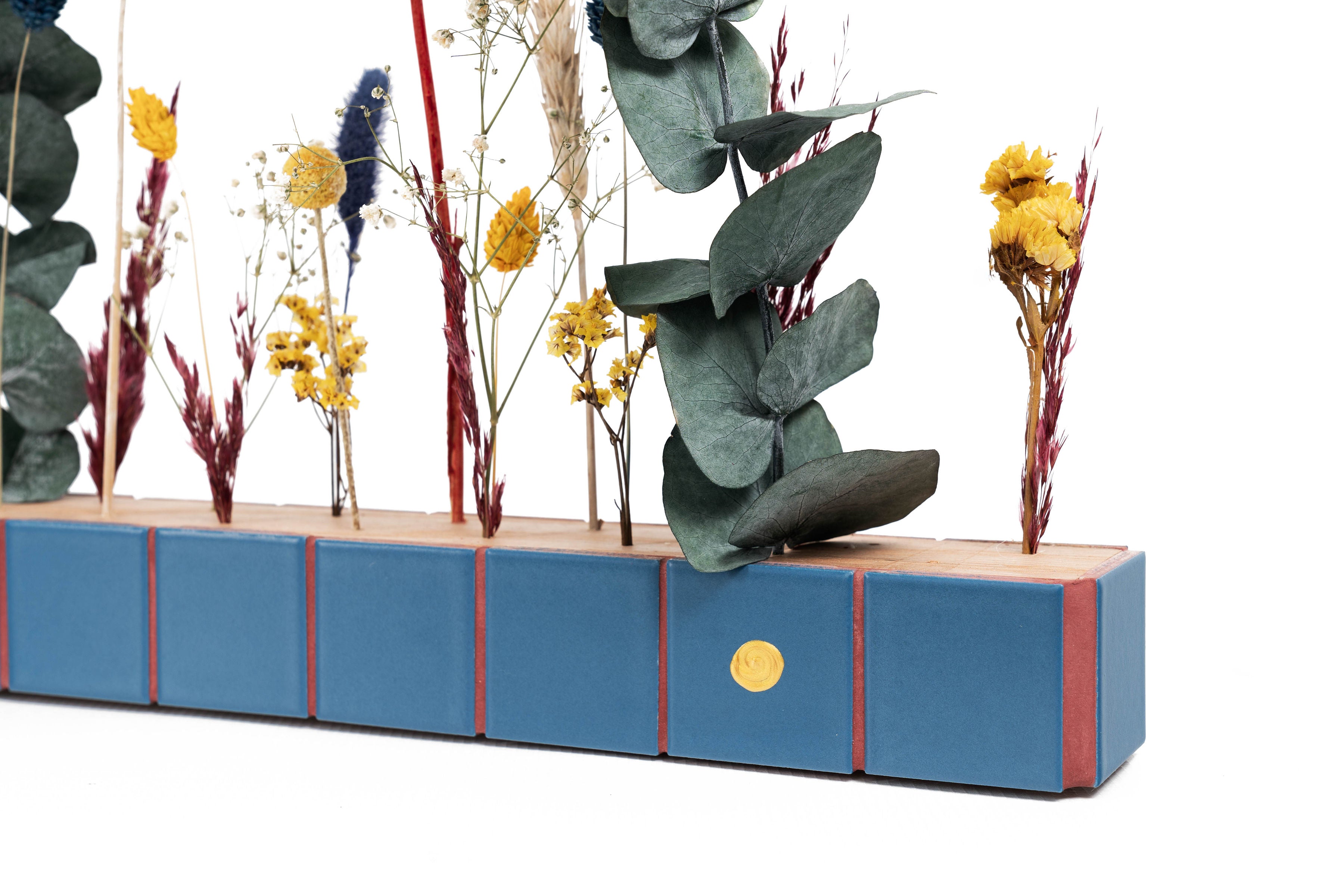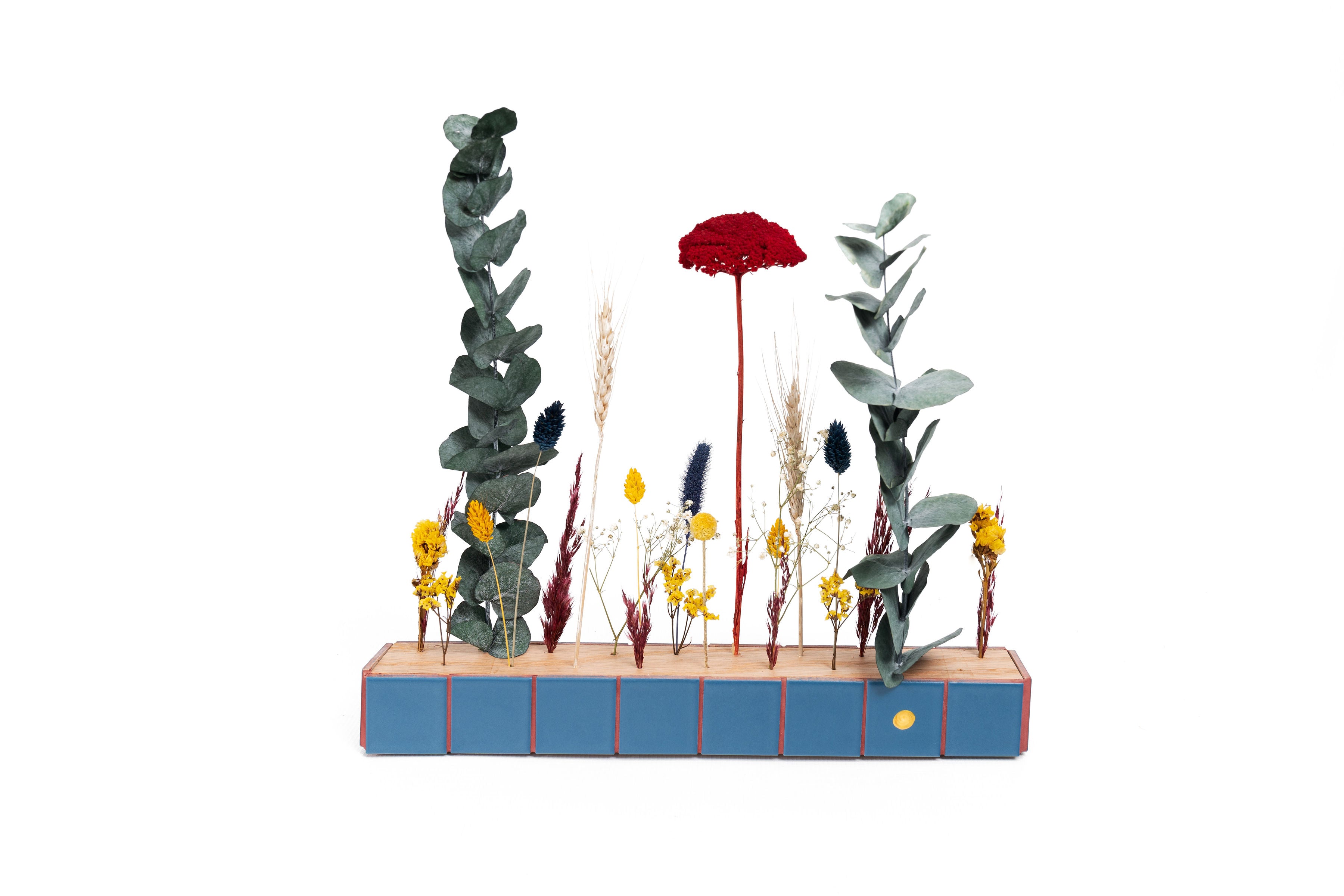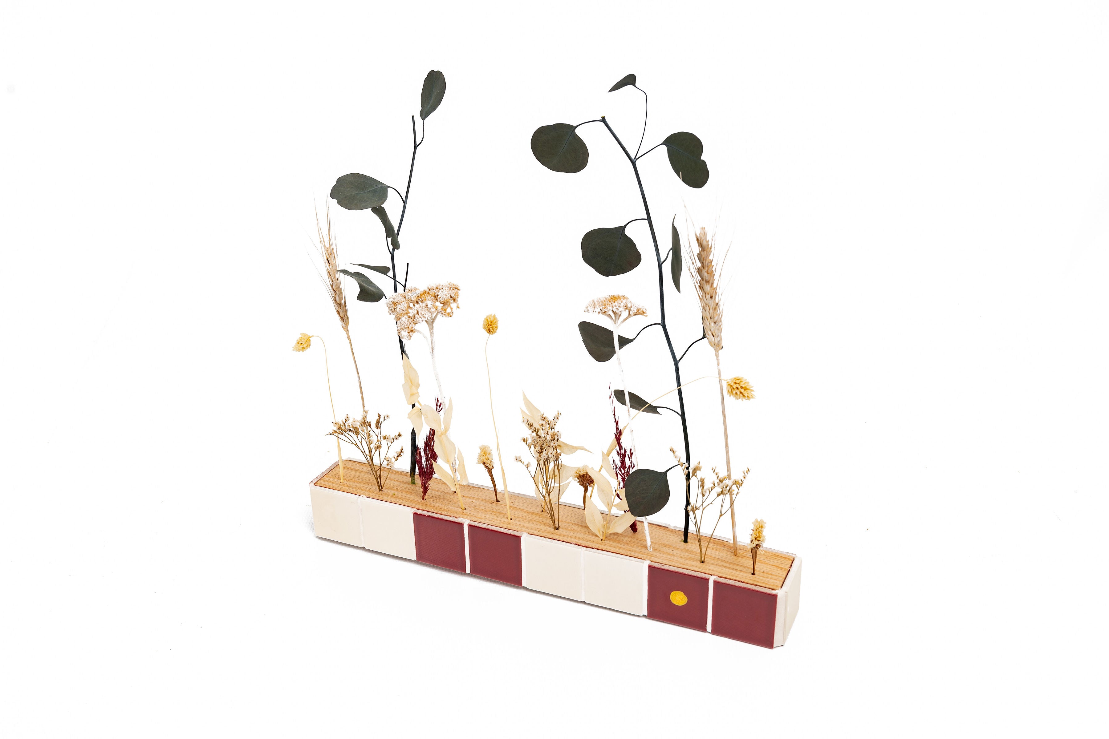 Expertly crafted, The Flower Bar boasts an oak bar and vibrant tiled colors. Adorned with dried flowers, it provides a unique and stylish addition to any room. Transform your space into a stunning floral haven with this sophisticated piece which can be placed on a table as a center piece, or on a console for welcoming guests as well as on the wall.