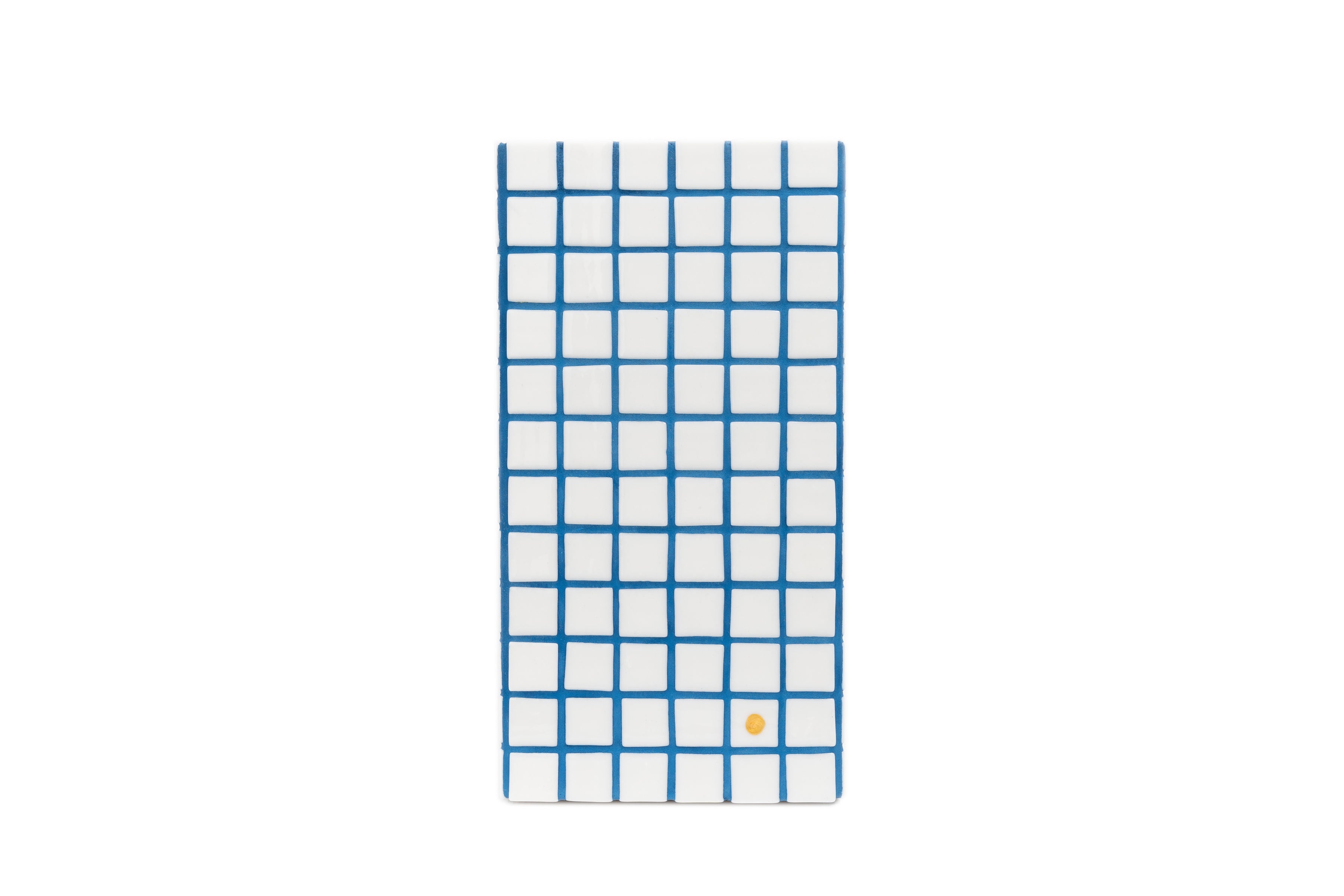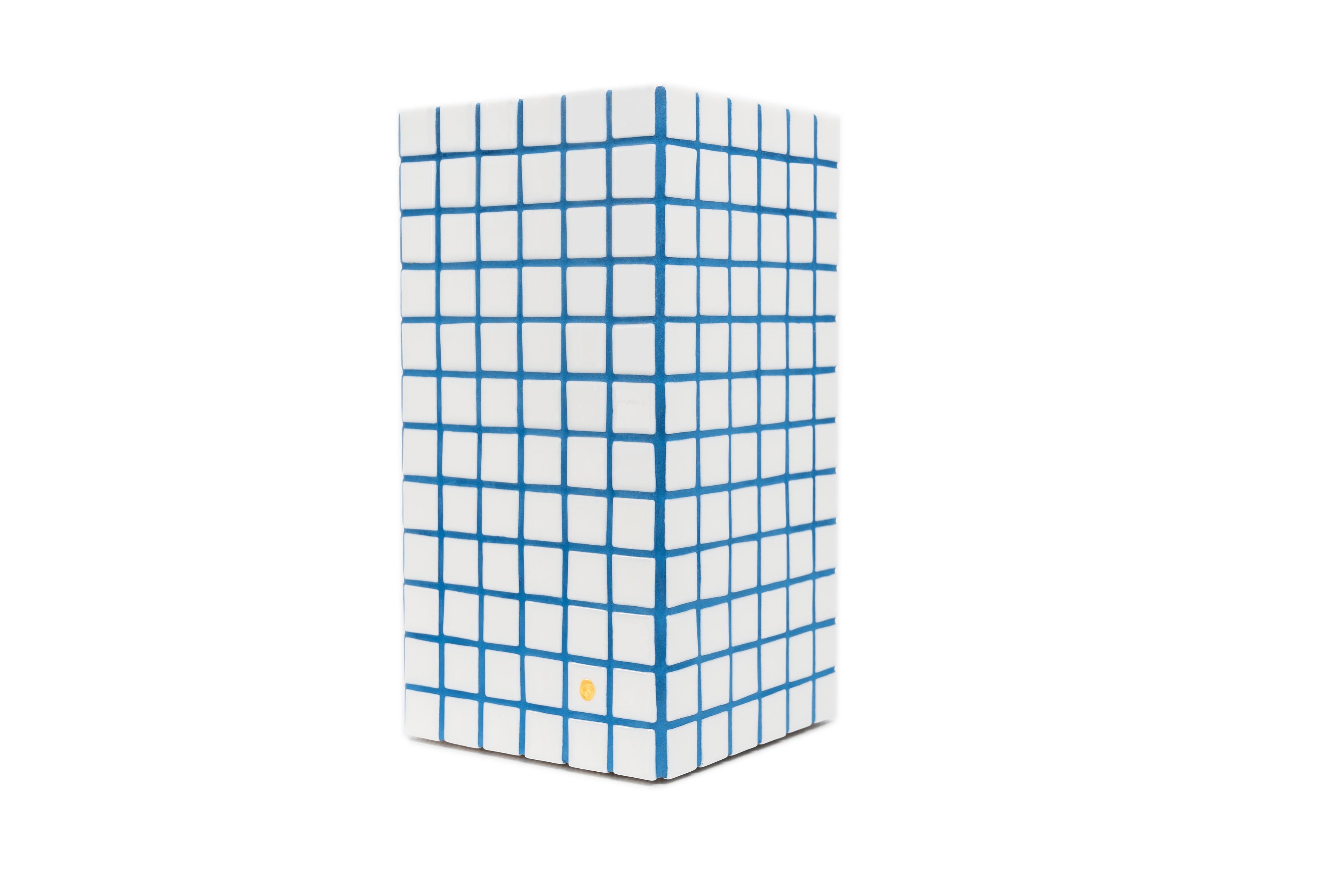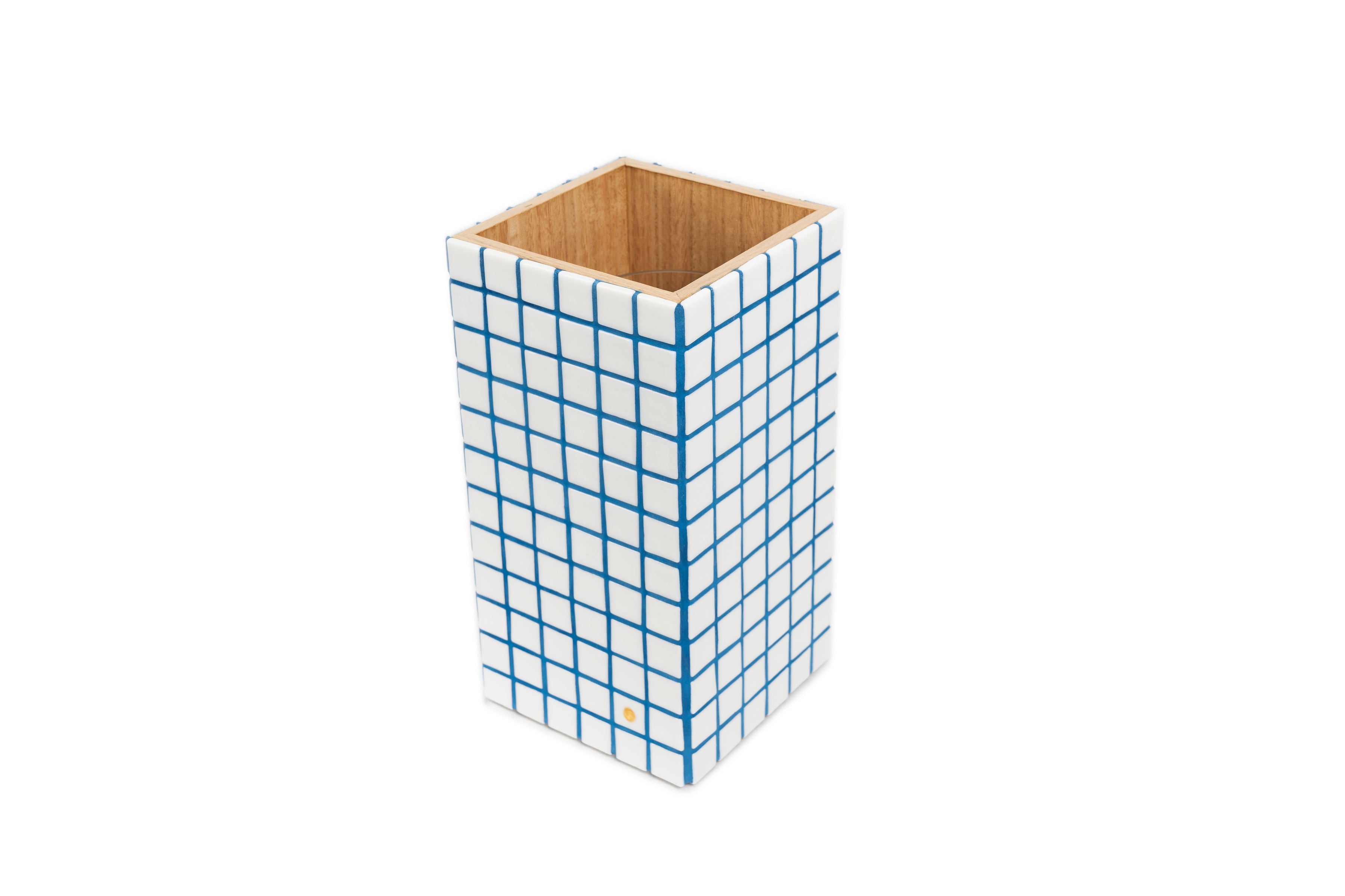 The cache vase is made of marine wood and glossy white glass tiles of 2,5 x 2,5 cm.